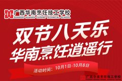 国庆已至, 上半年在家里憋了这么久, 你真忍得住长假不出去玩? 快看看这最后的上车机会吧! 不用请假、放肆high玩! 广西华南烹饪技工学校 2020年10月1号-8号 特色美食展台花样多 报名送精装月饼礼盒 美食体验课免