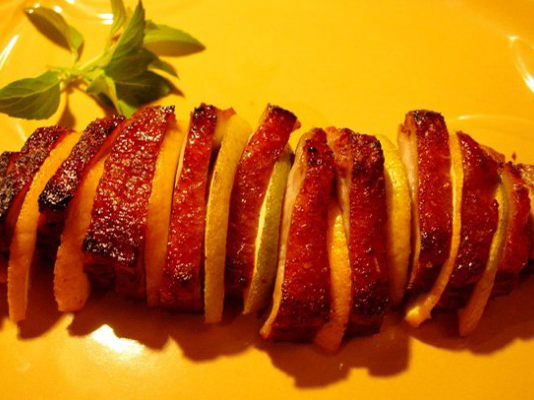 6、取出鸭胸肉,稍微冷却后切片,将香橙片夹在鸭胸肉之间,挤紧;涂抹一层蜜汁烤肉酱,再入烤箱,烤5分钟即可。