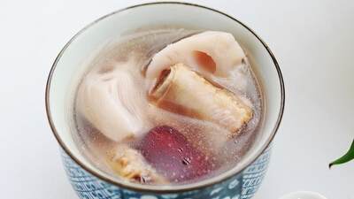 原料:猪肋排400g、精盐1茶匙、莲藕300g、红枣10个、生姜一大块
