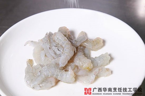 工艺流程:1.将鲜虾去虾线,加入盐、鸡精、蛋清、生粉、料酒腌制上浆;