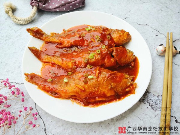 11、再把黄花鱼翻个面,当然也可以用勺子把汤汁往鱼身上淋一下,让鱼的两面都被番茄汁包裹着,这样才入味哦,汤汁快收干了就可以出锅啦。