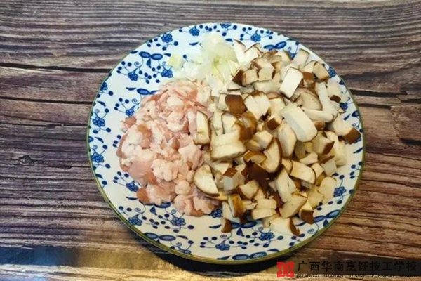 2、把香菇洗净后去蒂切成小丁;猪肉剁成肉末;大葱切成葱花,生姜切成姜末备用。