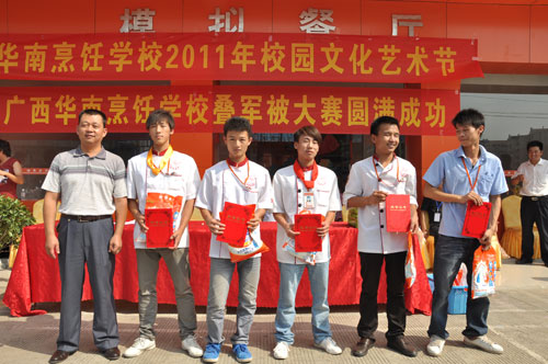 为庆祝中华人民共和国成立六十二周年,对学生进行爱国主义和集体主义教育,增强学生的民族自豪感,及展示华南烹饪在校学生青春风采,让更多学生参与学校艺术活动,更好地开展校园文化生活,广西华南烹饪学校迎国庆大