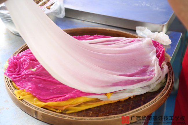 粉色,绿色,紫色,金黄色。。。凉拌,加汤,淋汁,卷筒。。。各种不同的吃法!只有你想不到,没有我做不到!不尝不知道,一尝忘不掉。。。近日,广西稻竹香餐饮管理公司金牌创始人黄健传先生在广西华南烹饪技工学校制作五彩竹蒸粉,下面小编就带你了解下有什么不同~