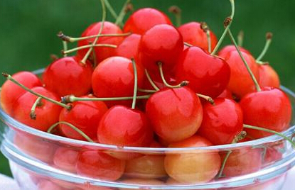 初夏时分,桃李尚未定芯,而樱桃已“先百果而含荣”,为此它赢得了“春果第一枝”的美誉。樱桃色味俱佳,营养丰富。它肉厚汁多、味道甜酸,除含一般水果的营养成分外,其铁含量居诸果之首,每100克高达6毫克,是苹果、桔子、梨的20倍;含维生素A也高于苹果、葡萄、柑子。此外,它的蛋白质、糖、钙、磷、维生素B、C及胡萝卜素的含量也很丰富。樱桃除生吃外,还可加工制成樱桃糕、樱桃酱、樱桃酒、樱桃罐头等食品,它们都营养可口,风味各俱。